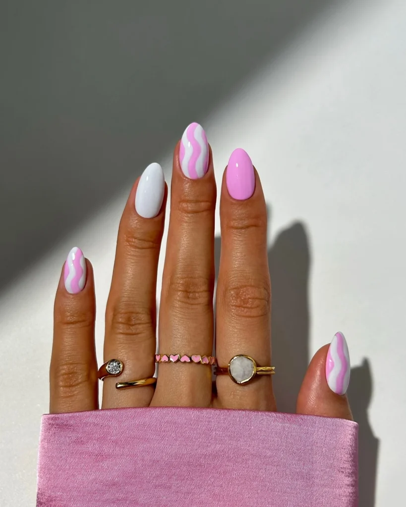 The wavy mix of pink and white feels playful yet polished, like cotton candy with a grown-up twist. It’s the kind of nail art that makes your coffee cup look like an accessory.
