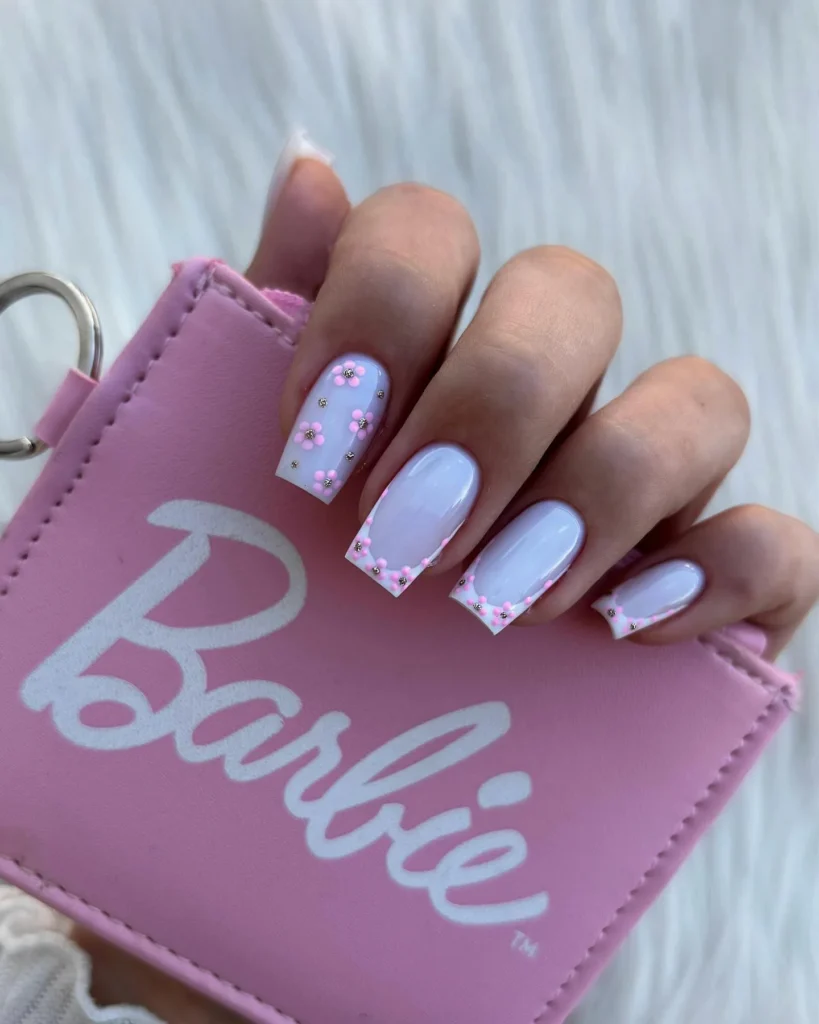 The moment I saw this one, it screamed Barbie-core perfection. The icy white base with pink floral accents feels dreamy, feminine, and playful like sugar frosting in nail form.