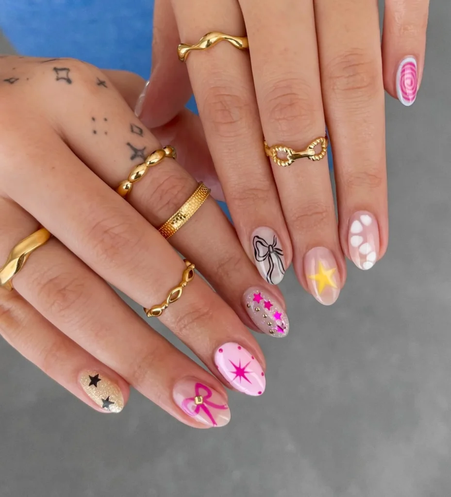 There’s something about this chaotic mix that just works. Stars, bows, dots it’s like every cute Pinterest board came to life on one manicure. Playful but still polished, this nail art is made for days when you want your hands to do the talking.