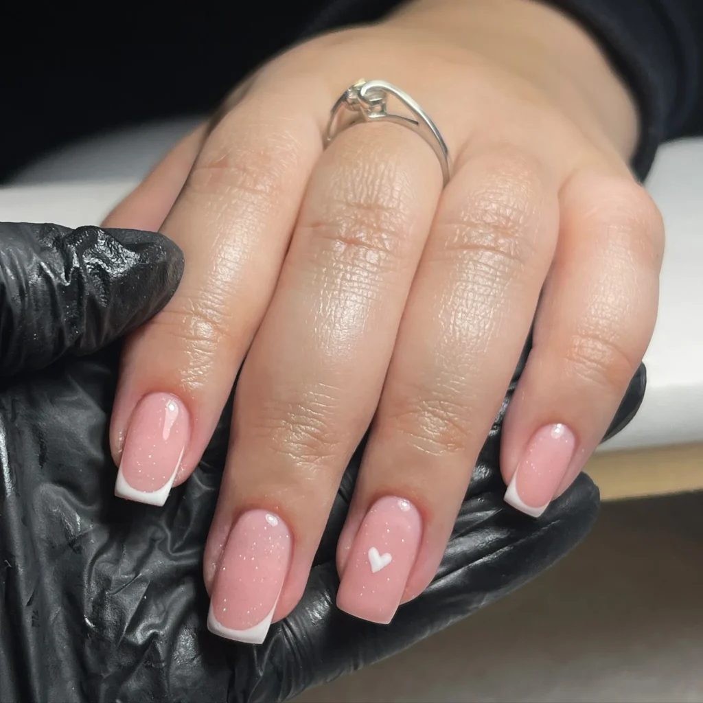 As soon as the top coat dried, I couldn’t stop staring. The classic pink-and-white French combo gets a glow-up with glitter and tiny heart accents. It’s sweet, flirty, and gives just the right hint of sparkle without stealing attention.