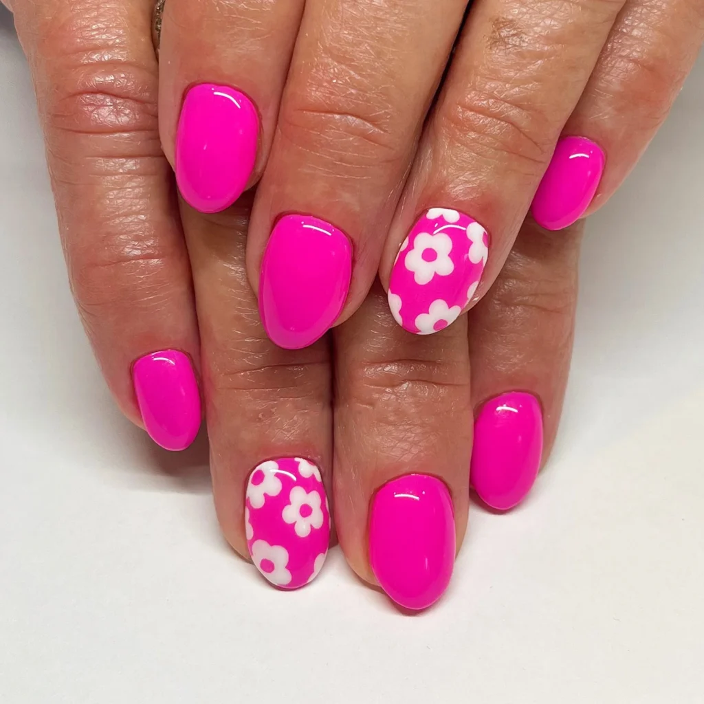 The color pop on these nails could stop traffic in the best way. The pink polish with white daisies feels straight out of a retro summer mood board. It’s bold, bright, and guaranteed to make your manicure the conversation starter.