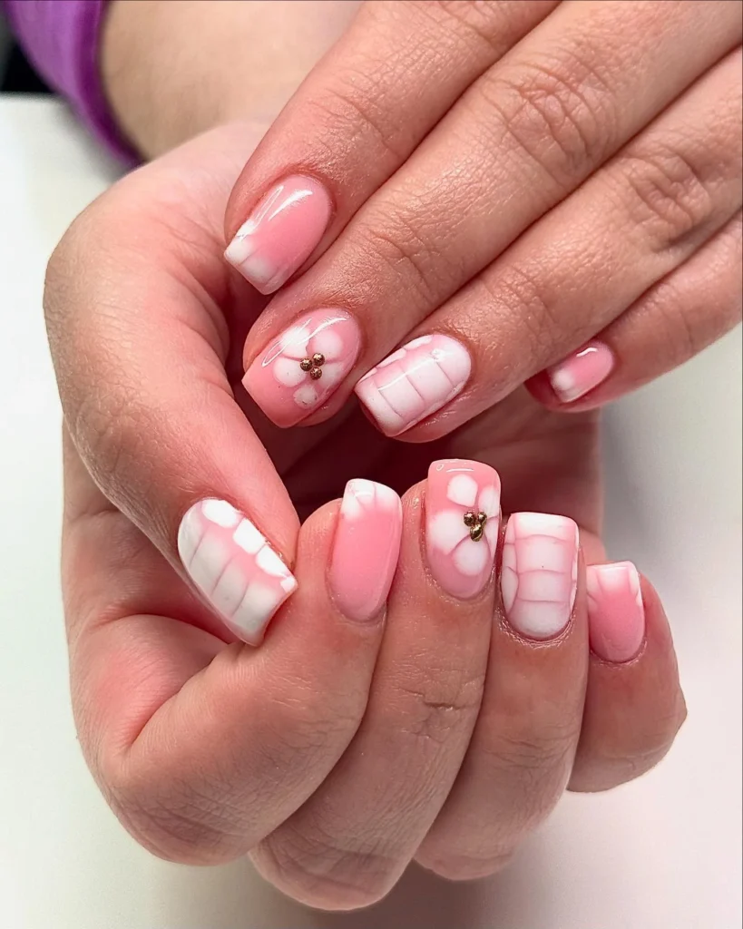 Picture a sunny brunch table, your nails wrapped around an iced latte, that’s this vibe. The pink-and-white contrast with tiny daisies adds instant cheer without going overboard.