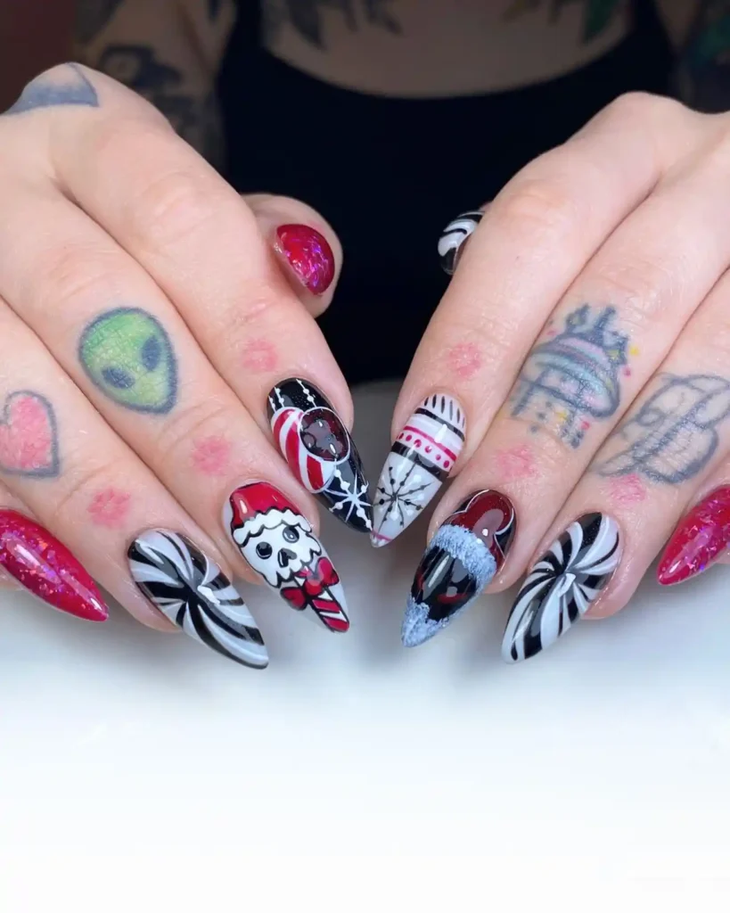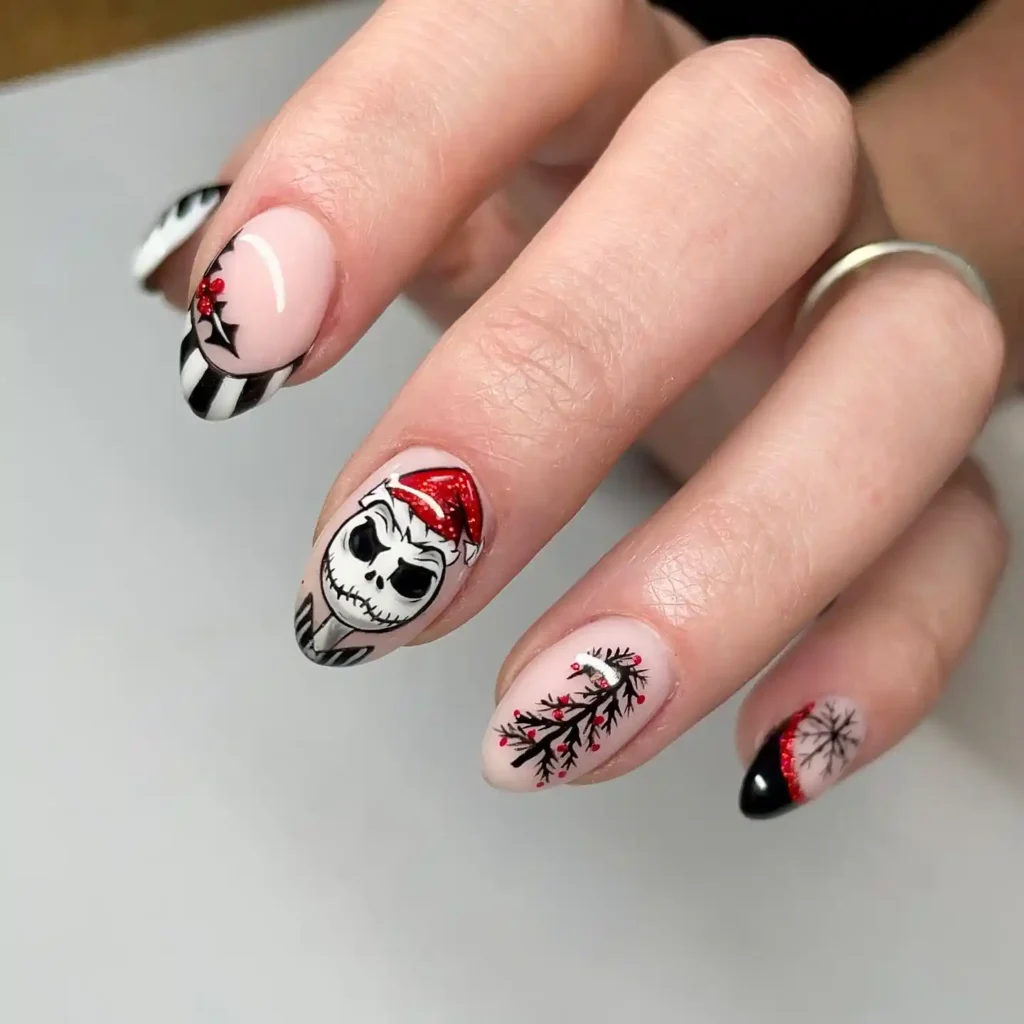 I love how the creamy nude base lets the black-and-white stripes pop. The Santa-hat skull steals the focus while the thorny branch adds a dark winter touch.
