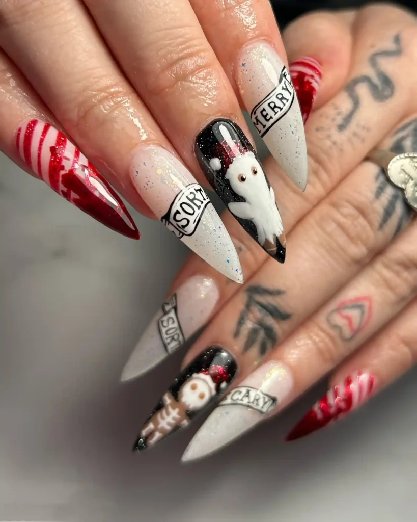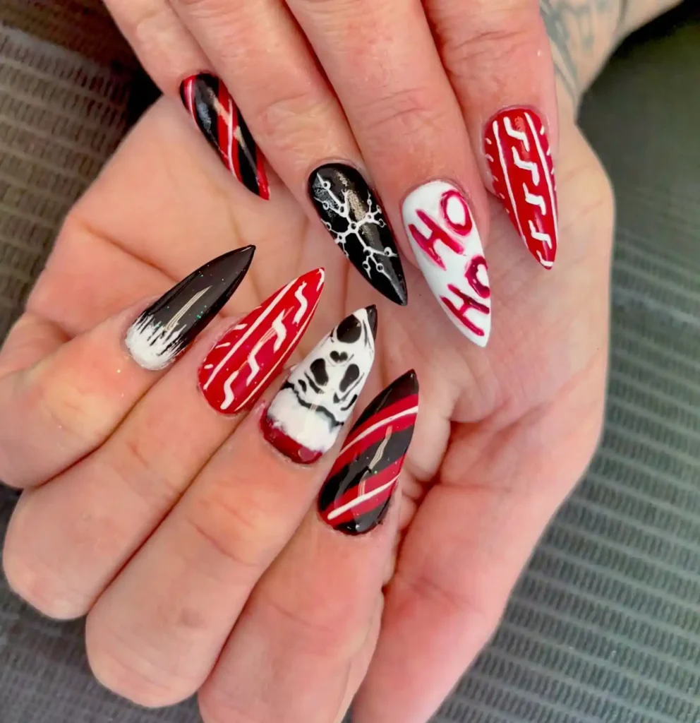 I used icy white sparkle tips against inky panels. The “Sorry Merry” banners, skeleton, and blood-red stripes turn it deliciously dark. Long points make the drama complete.
