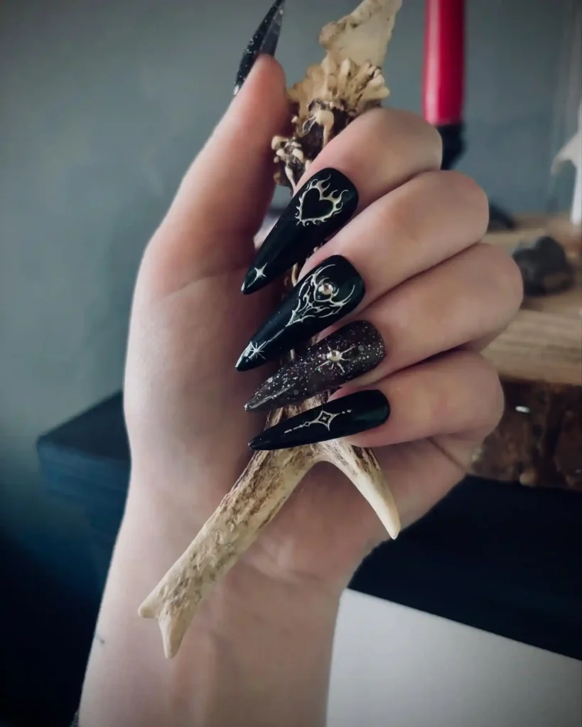 These deep black stilettos glow with pale silver flames and tiny stars. A single glitter nail adds a cold winter shimmer. They feel like a dark sky right before midnight mass.