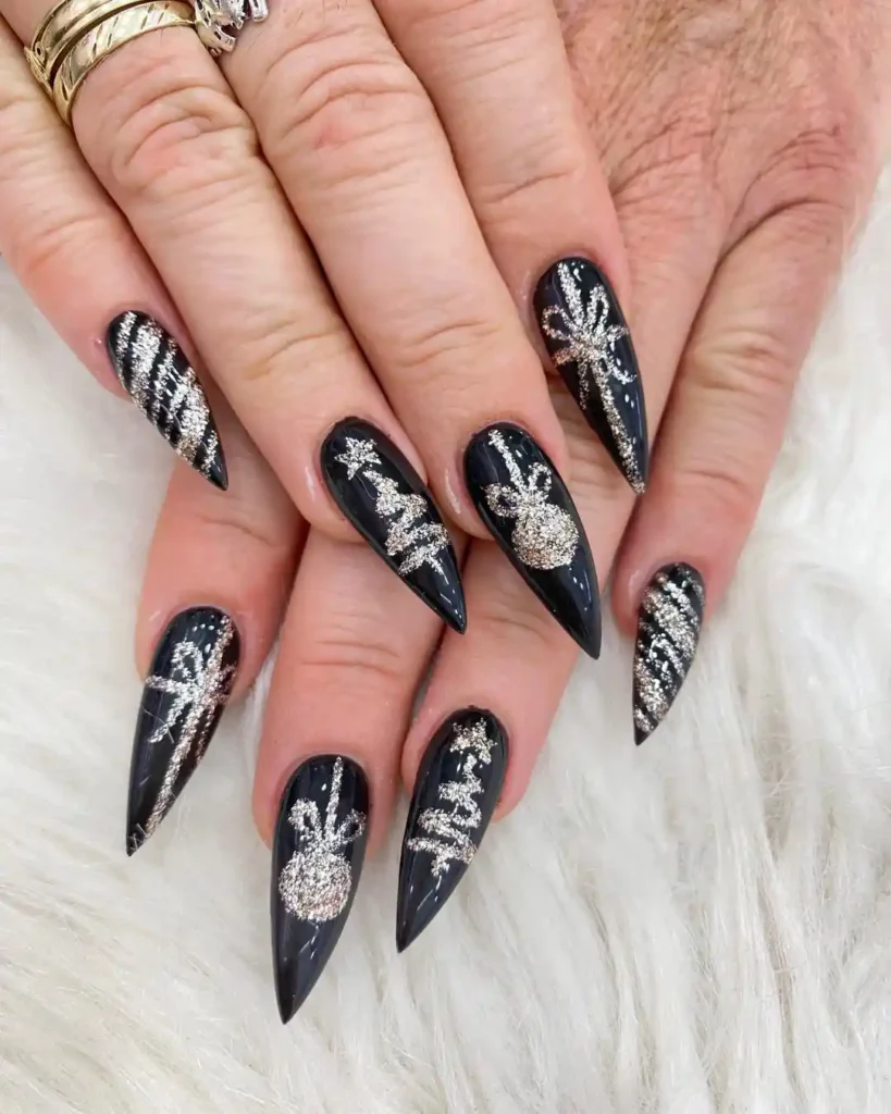 I chose inky black tips and drew silver trees and baubles. The glitter lines look like tinsel under dim lights. Sleek shapes keep the set fierce and festive.