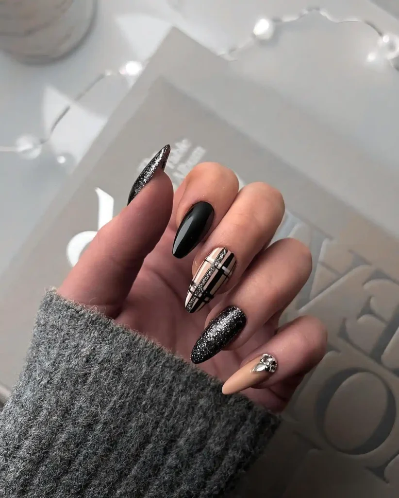 This set blends black, beige, and gunmetal. Plaid art, a glitter accent, and a small crystal feel dressy yet dark. It pairs well with a cozy sweater and bold rings.