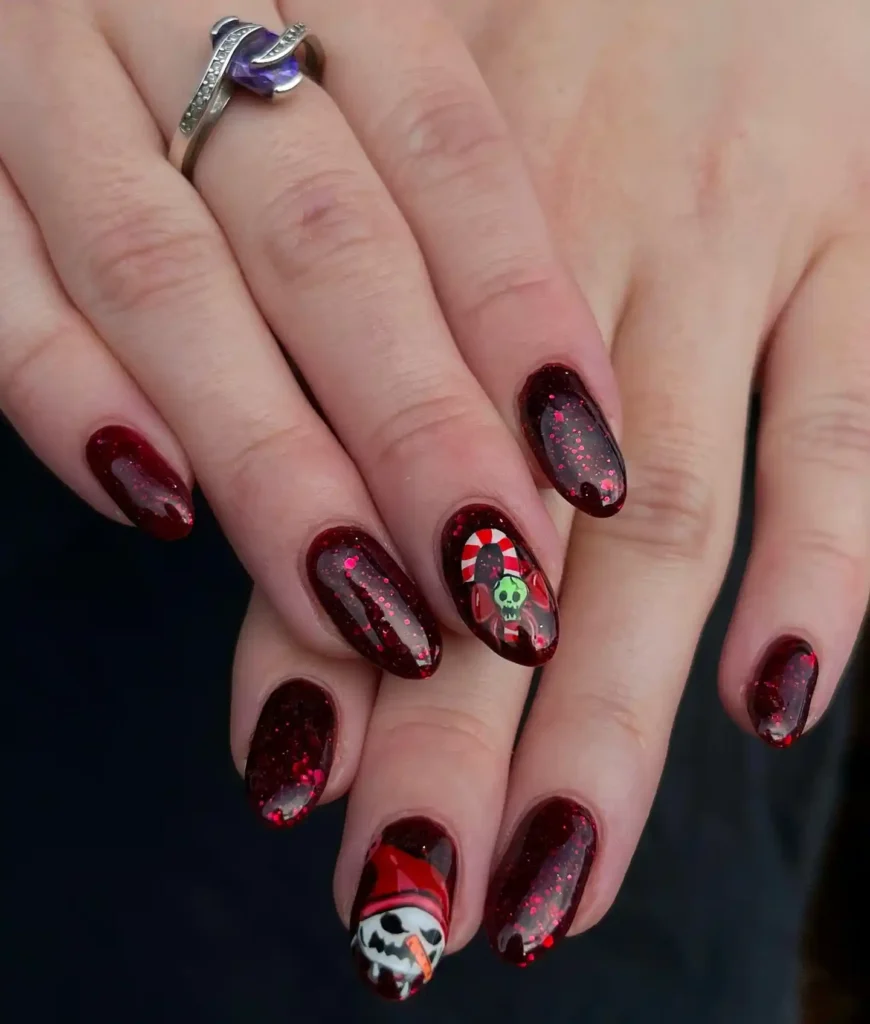 Deep cherry glitter makes a rich backdrop. I paired Jack’s face with a creepy green skull candy. The finish looks glossy and dramatic.