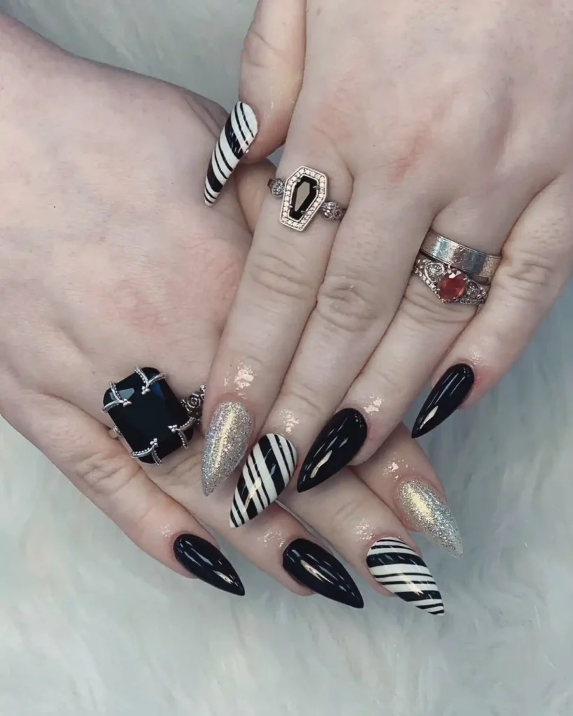 I balanced inky black with sharp ivory stripes. A couple of nails wear metallic glitter for contrast. The look feels sleek, like spooky candy canes.