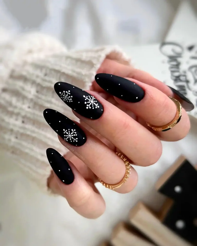 Matte black keeps everything bold and clean. I dotted tiny stars and painted crisp snowflakes. The contrast is striking yet simple to wear.