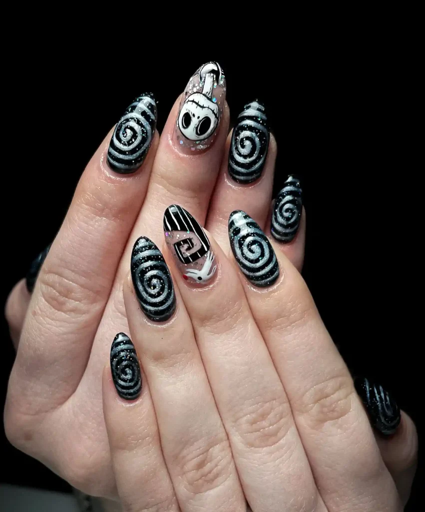 #9. Spiral Night Nail With Tim Burton Vibes