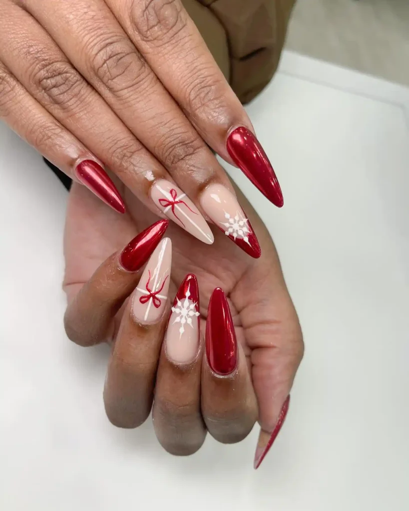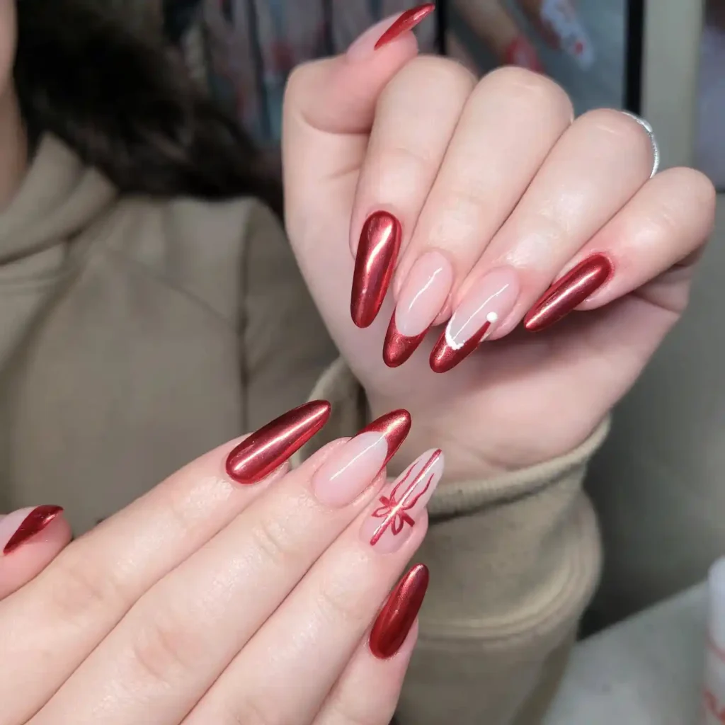I mixed red chrome with soft nude and tiny ribbon lines. A delicate snowflake keeps it seasonal. The negative space French tip feels airy. It’s minimal gift-wrap energy with mirror shine.