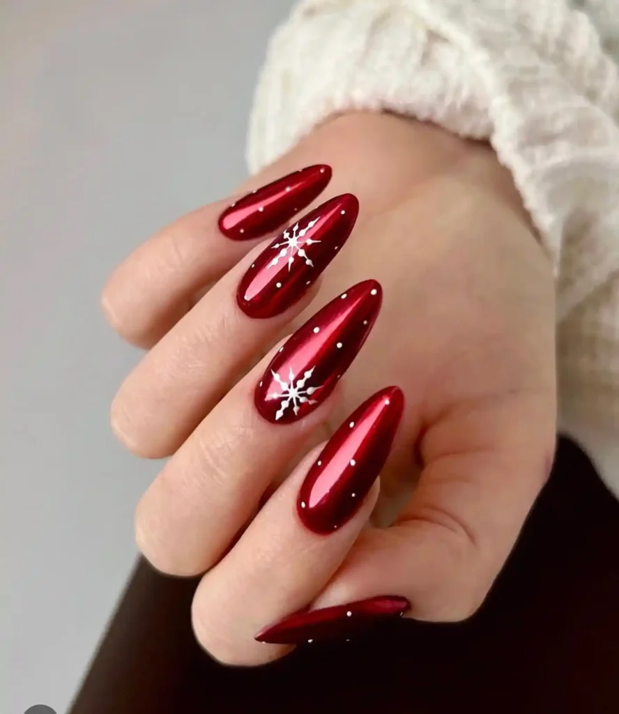 This set gives warm holiday energy. The ruby chrome reflects the tree lights and looks rich. The almond shape is flattering and comfortable. It’s festive without any extra art.