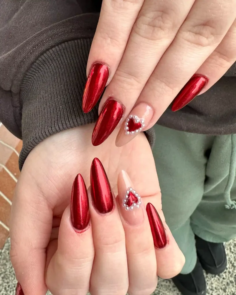 These nails lean romantic and glossy. Most fingers shine in deep red chrome, while the accent nail stays sheer with a tiny chrome heart framed by pearls.
