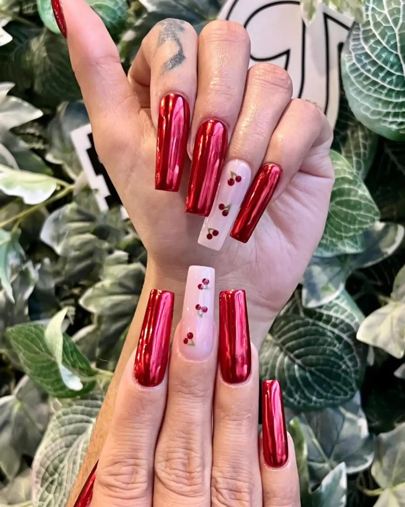 Bold coffin tips glow in a bright red mirror finish. I kept two accent nails milky and dotted them with tiny cherry decals. The mix reads fun and a little retro. It’s a simple way to break up the solid chrome.