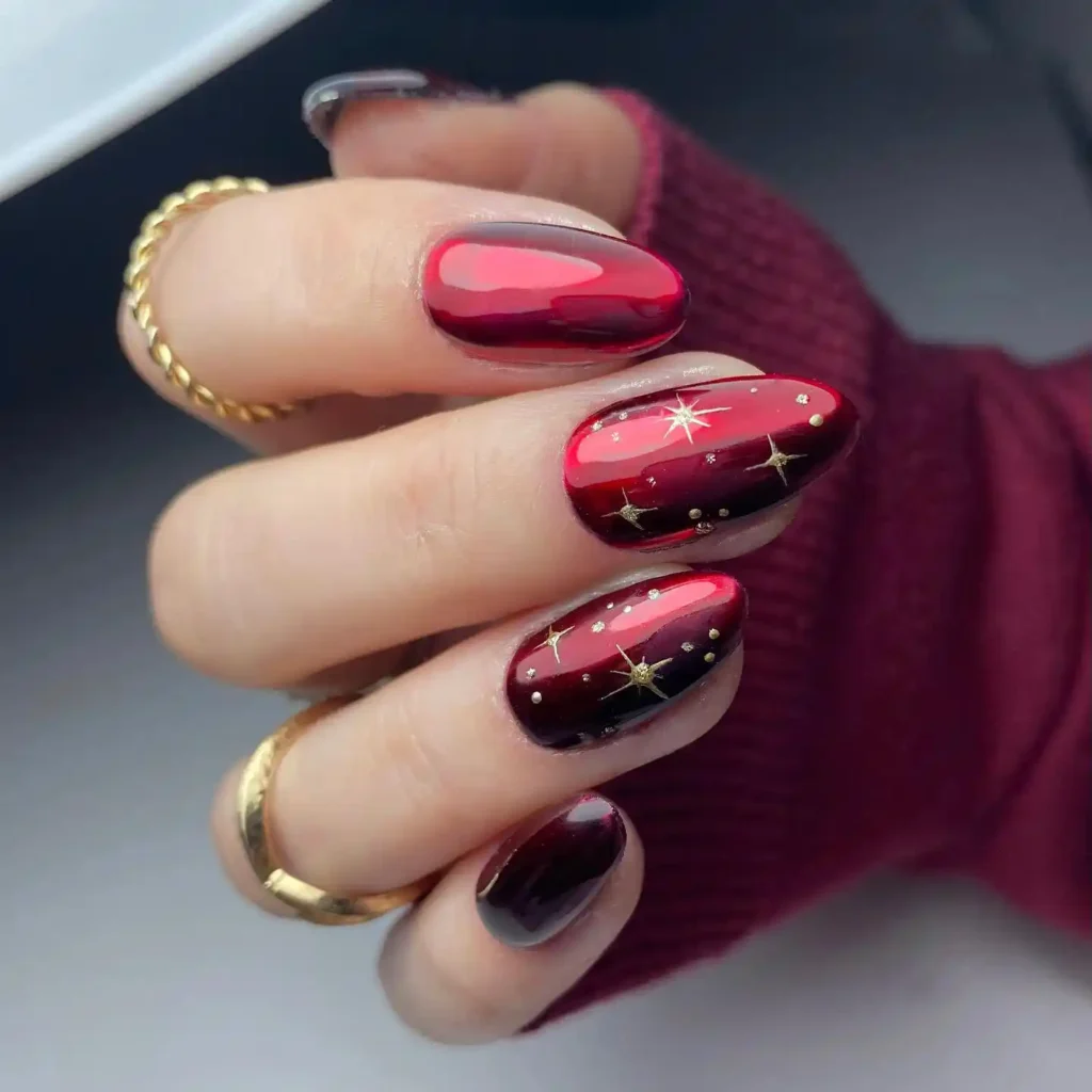 This red chrome fades into deep wine and looks like a tiny night sky. Gold star decals add a soft sparkle. The shine is glassy and smooth. It feels festive without being loud.