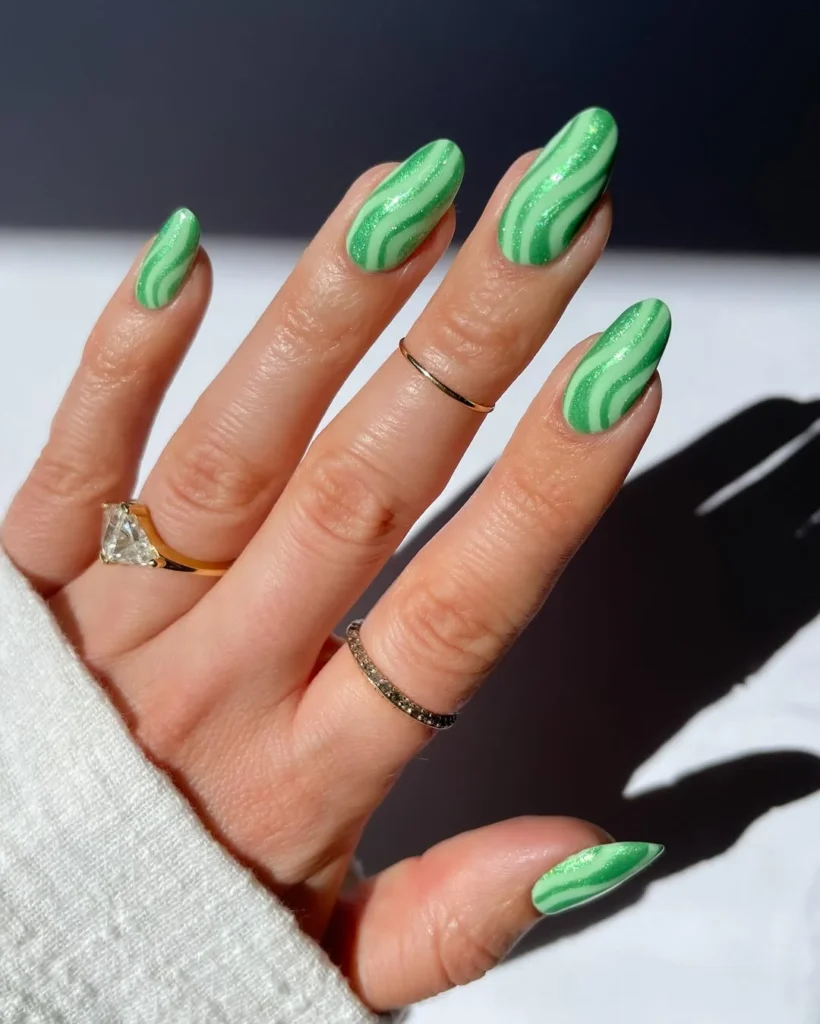 I notice the soft mint base first, but the lighter wavy lines are what keep my eyes moving across the nails. The shimmer inside the curves catches light without feeling heavy, which makes the almond shape feel lighter than it actually is. Everything looks smooth and controlled, but not stiff.