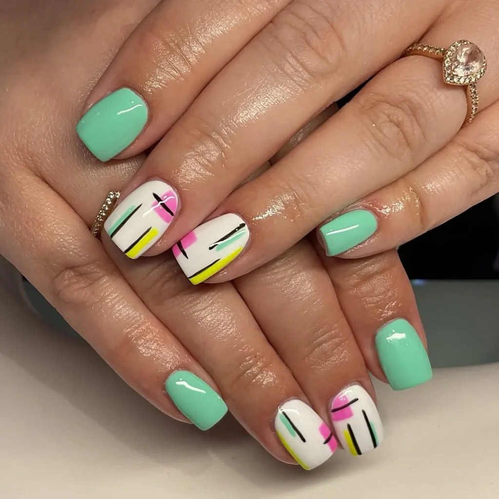 This design feels playful but still controlled. The mint nails keep things simple, while the white base with thin color strokes adds just enough variation. The short length makes it feel practical, and the glossy finish ties everything together cleanly.