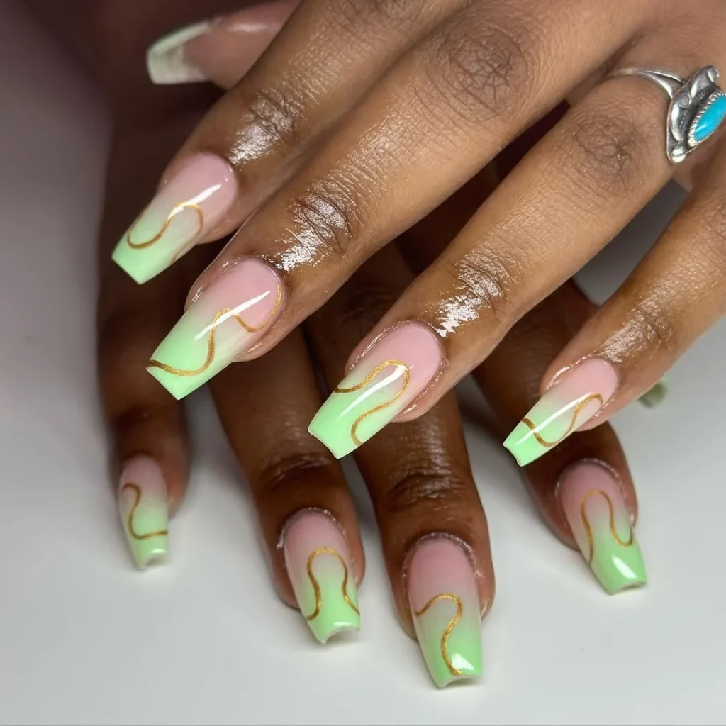 The thin gold lines are what I notice first. They sit lightly on top of the mint base and follow gentle curves, which keeps the look fluid. The short rounded shape makes it feel softer overall. I like how the gold adds contrast without overpowering the base color.