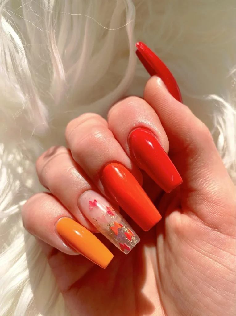 Vibrancy bursts through this design with a seamless transition from fiery red to warm orange, echoing the glow of autumn leaves. The glossy finish gives the nails a mirror-like reflection that instantly catches the light. A standout feature is the accent nail, decorated with delicate butterfly decals in soft pinks and shimmering gold foils.