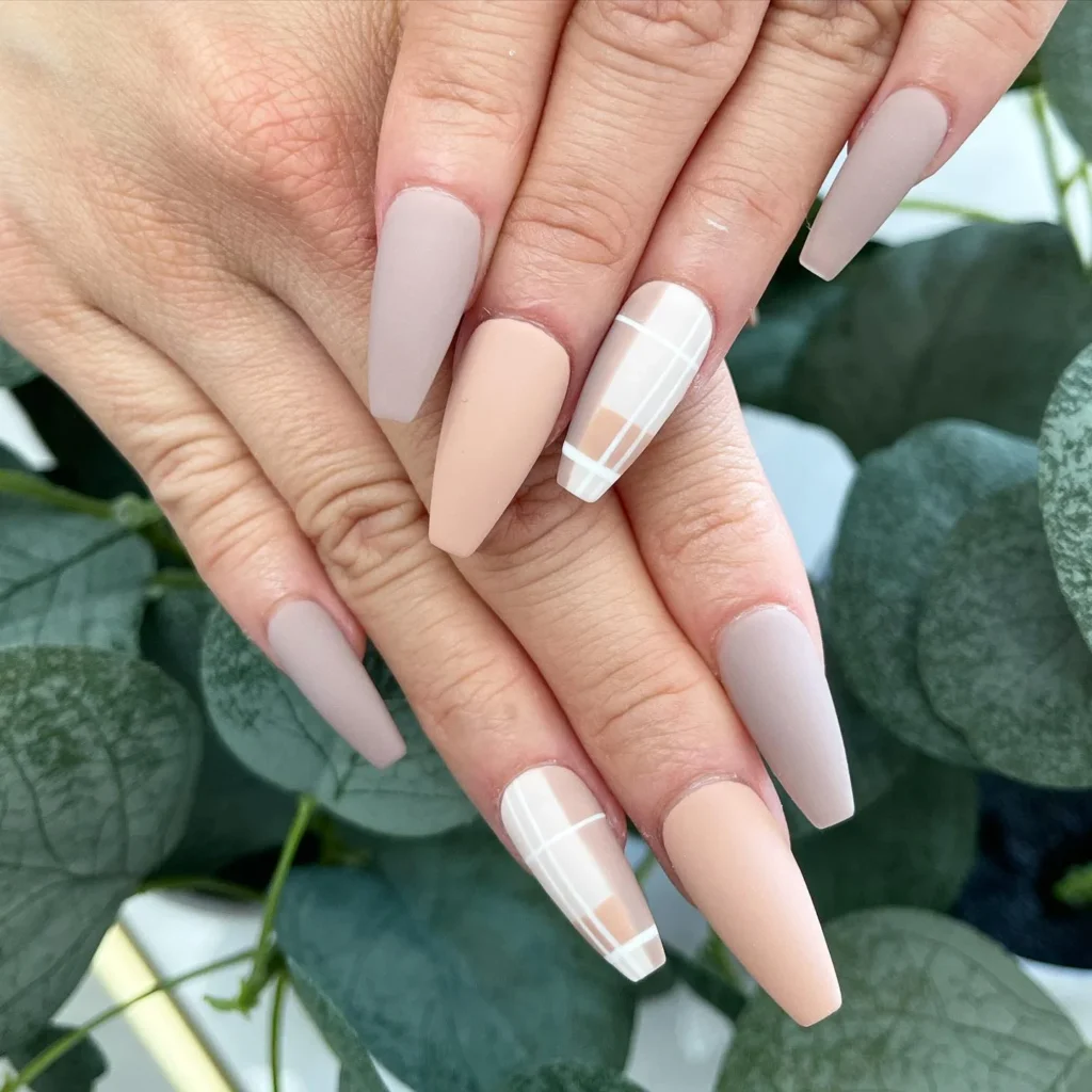 #11. Neutral Matte Ballerina Nails with Plaid Accent
