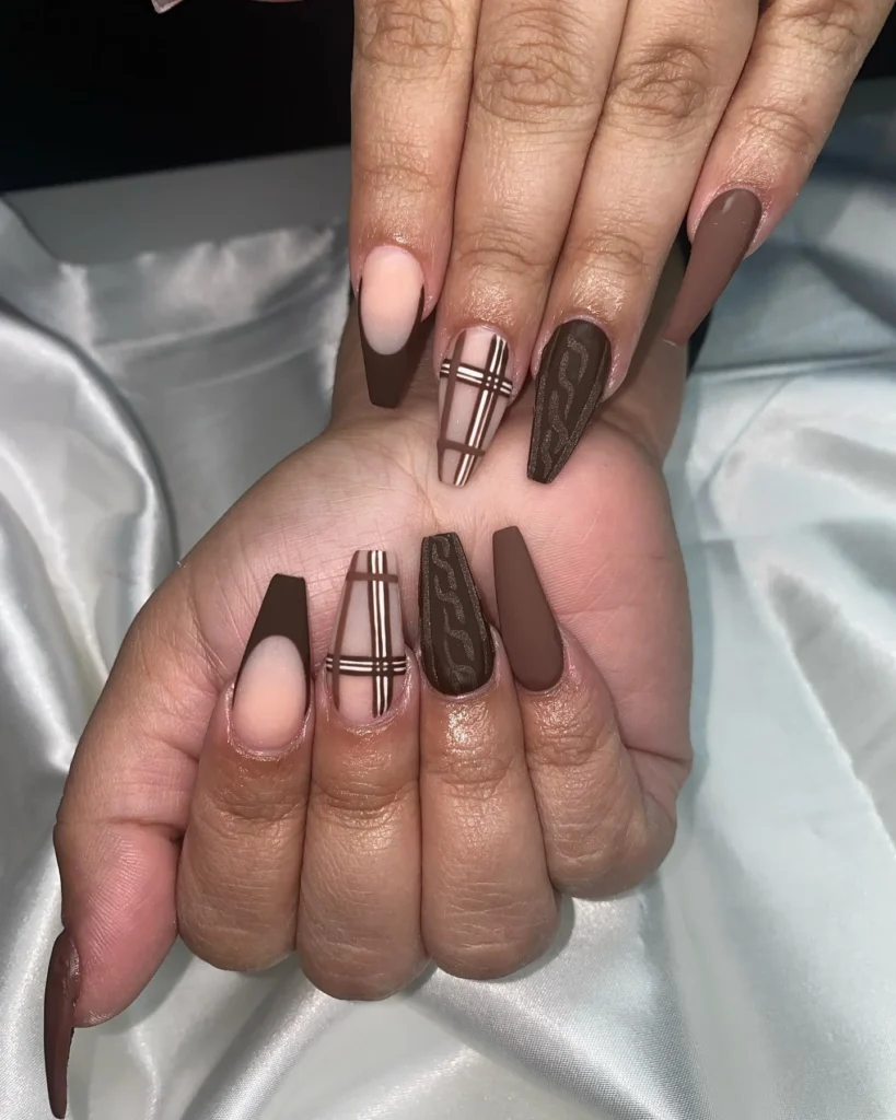 Warm chocolate shades define this manicure, complemented by a variety of textures and accents. One nail stands out with a cozy sweater-inspired embossed pattern, while another features a sleek plaid detail in black and nude. The matte finish ties the look together, giving it an earthy sophistication.