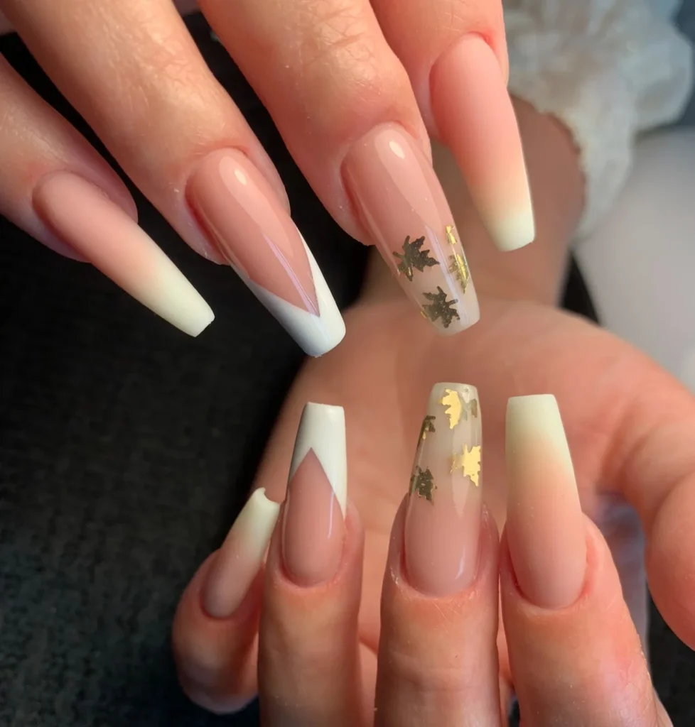 Delicate pink-to-white ombré nails pair beautifully with bold French tips, creating a soft and feminine look. Two accent nails add seasonal charm, featuring golden foil and autumn leaf designs. The glossy finish makes the details stand out, offering both elegance and warmth.