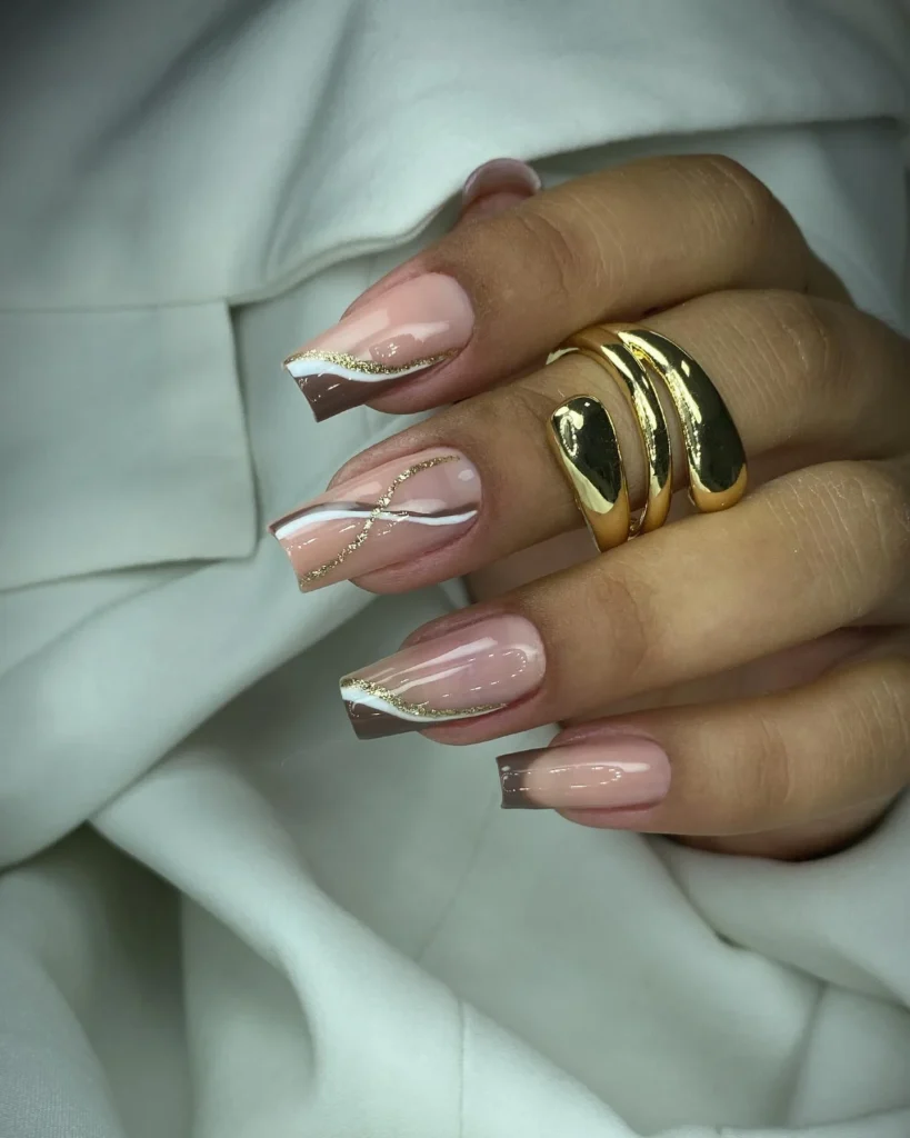 Neutral nude tones provide the base for this chic manicure, elevated with graceful swirls of gold and white. The metallic accents shimmer under the light, giving the nails a refined, glamorous edge. A glossy finish enhances the flowing patterns, adding fluidity and movement.