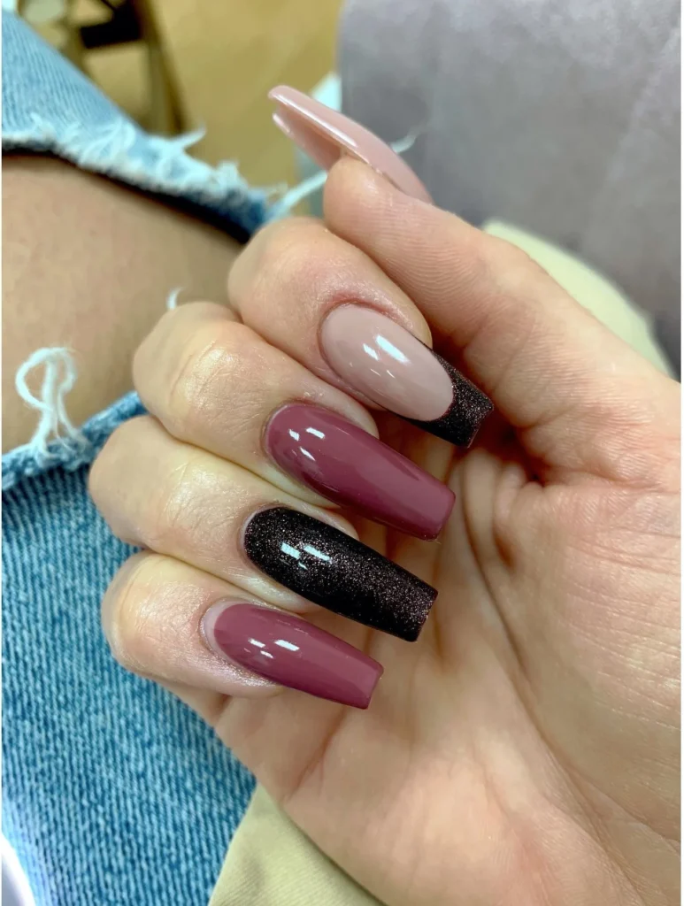 Richness flows through the deep mauve tones, paired beautifully with soft nude shades that add balance and elegance. Dark glittered accents break the monotony, introducing a touch of drama to the look. The high-shine finish reflects light effortlessly, enhancing the manicure’s sleek, polished vibe .