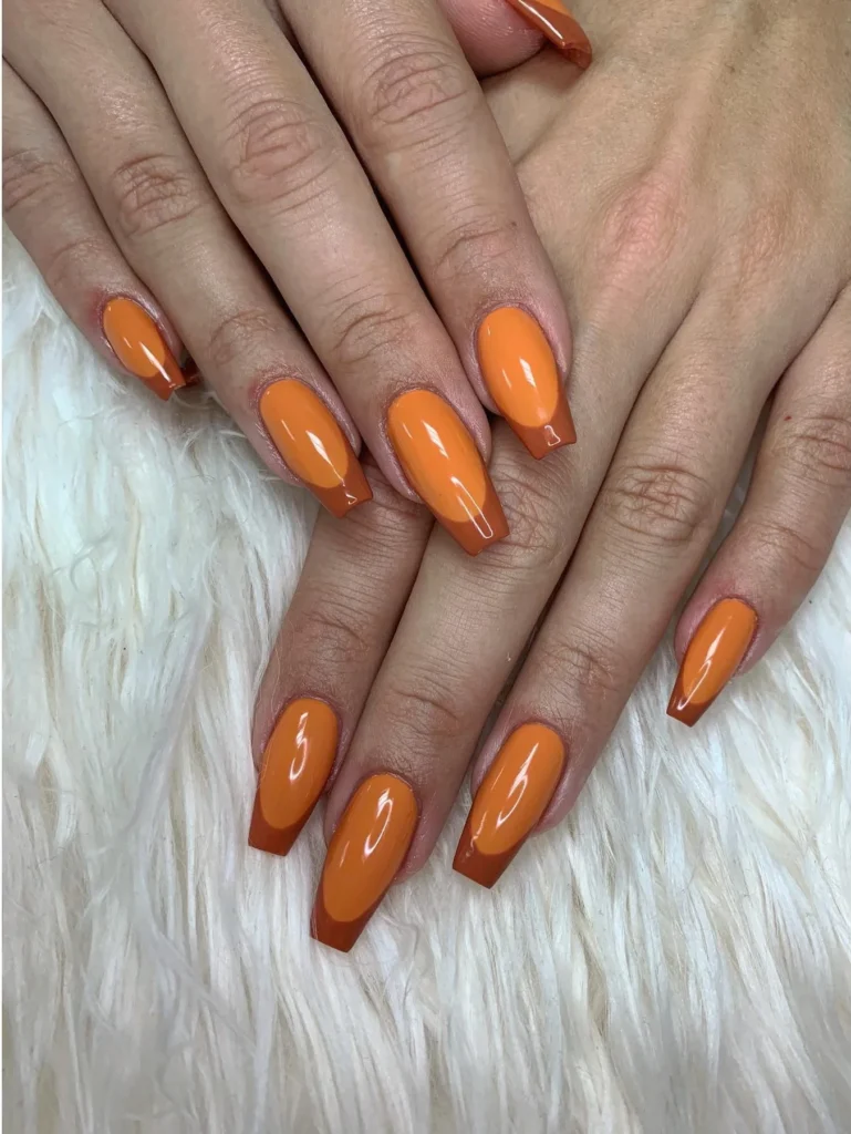 Boldness takes center stage with this striking set of solid orange nails, finished to a flawless gloss. The vibrant shade channels the cozy energy of fall pumpkins and golden sunsets, making it seasonally fitting yet timeless. Without extra embellishments, the design feels clean, powerful, and confident.