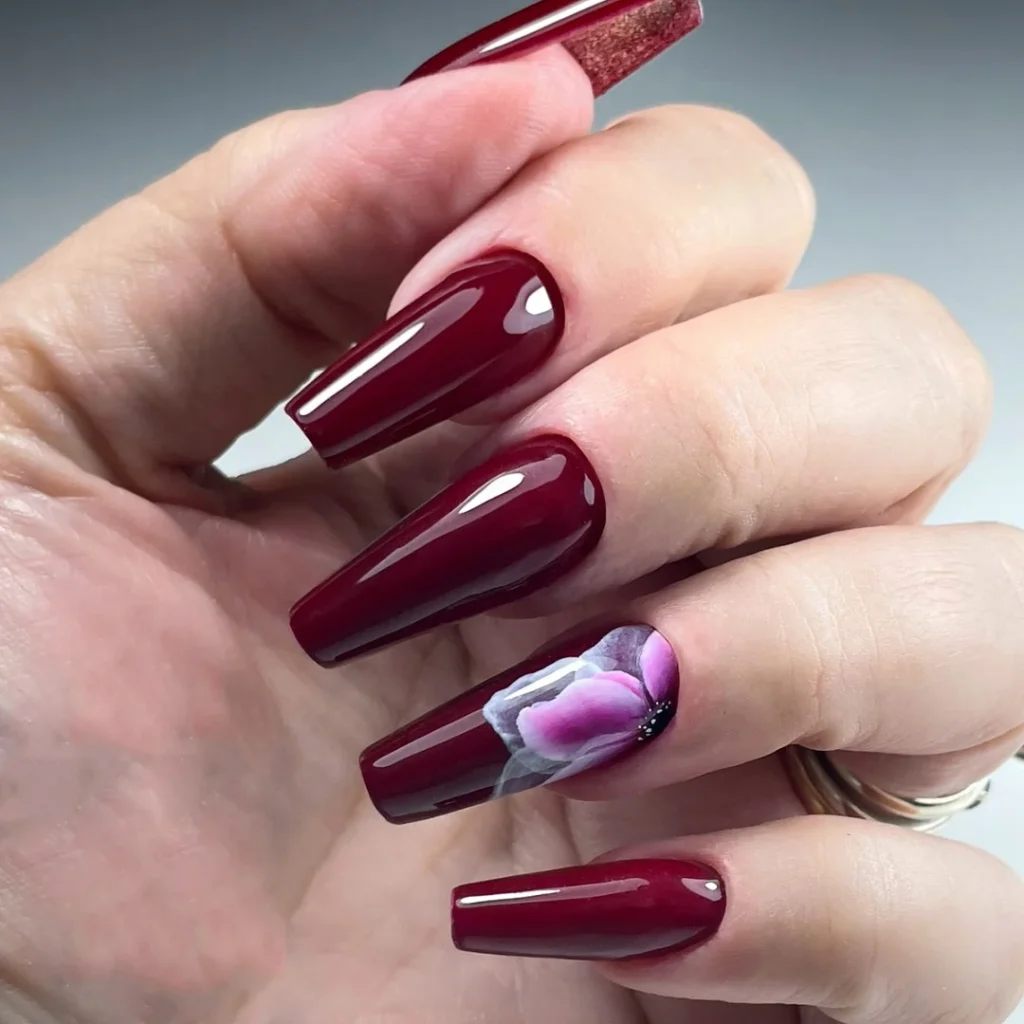 Depth and elegance meet in these luxurious burgundy nails, polished to a glass-like finish. The bold shade creates an air of sophistication that is both dramatic and timeless. A single accent nail introduces softness, featuring a hand-painted flower in delicate shades of pink and white.