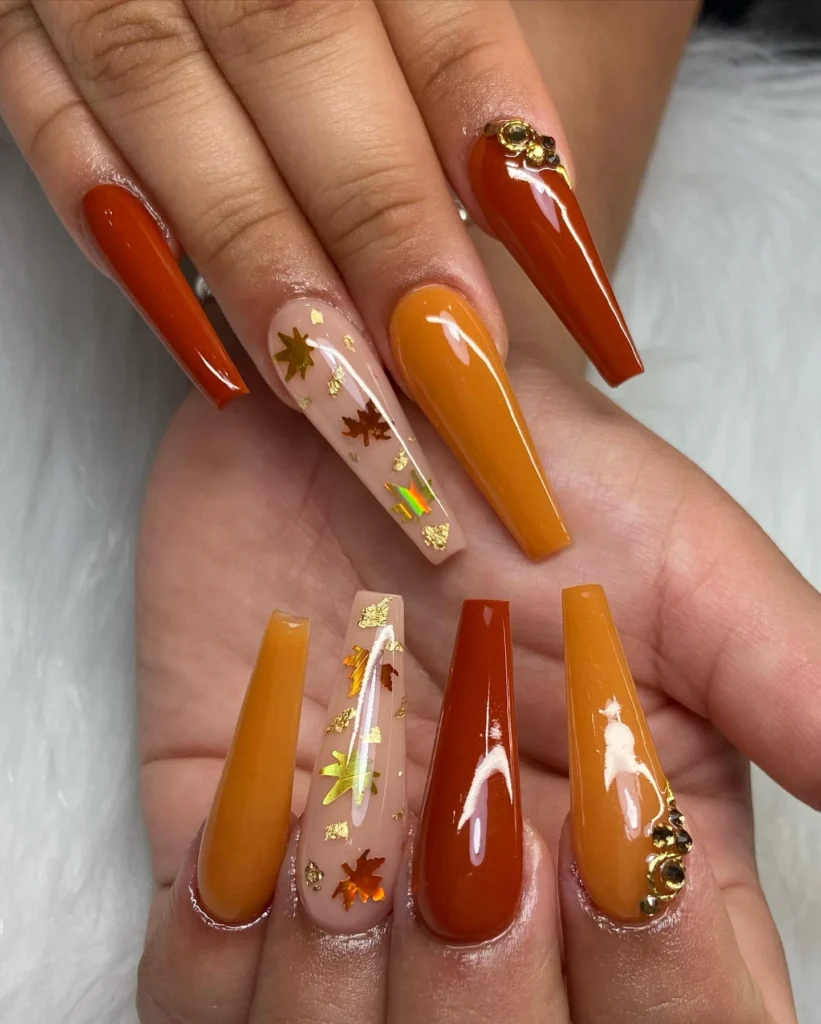 Warmth radiates from this design, combining amber, caramel, and rich orange tones across long ballerina nails. Transparent accent nails decorated with metallic leaf decals echo the beauty of falling autumn leaves. Gold foils and gemstone embellishments elevate the look with luxurious sparkle and depth.