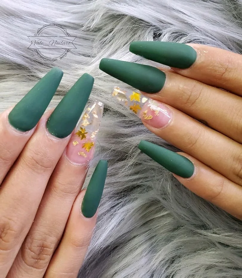 #7. Matte Green Ballerina Nails with Leaf Accents