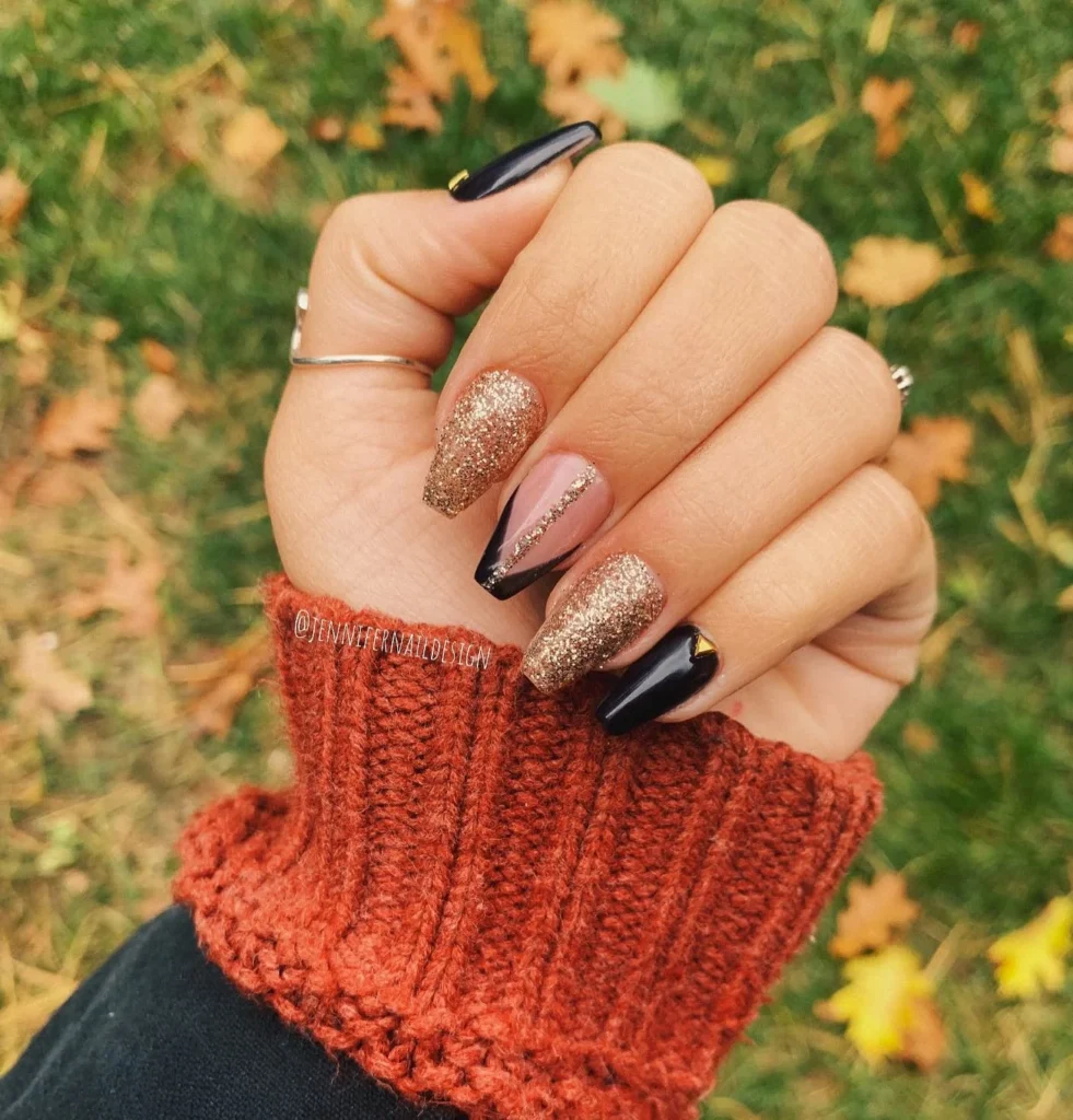 Glamour and boldness unite in this striking combination of sleek black polish and sparkling golden glitter. The geometric designs with glitter lines add depth and artistry to the look, making each nail feel like a statement piece. Against the autumn backdrop, the nails exude cozy yet luxurious charm.