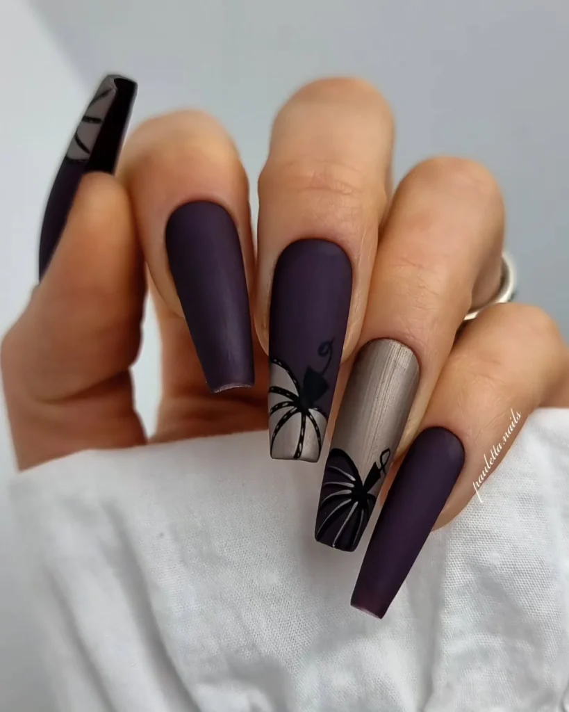 Creativity shines through this festive manicure featuring rich matte plum nails paired with taupe accents. Black pumpkin outlines are delicately painted, adding a seasonal flair that feels playful yet refined. The matte finish enhances the design’s elegance, offering a soft texture that contrasts beautifully with the art.