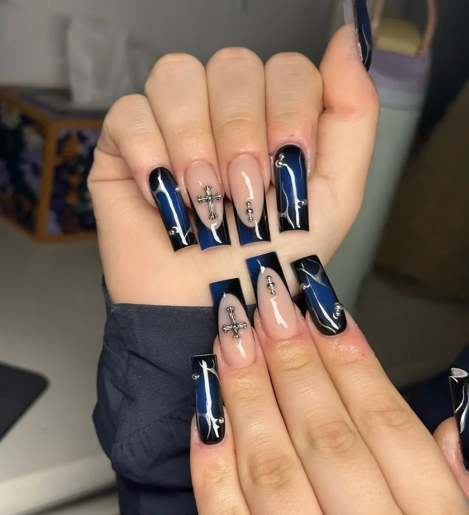 The dark blue chrome paired with silver cross charms gives serious bold energy. Every time I catch the reflection, it feels like wearable armor but make it fashion. The high-gloss shine makes these nails feel rich and unapologetic