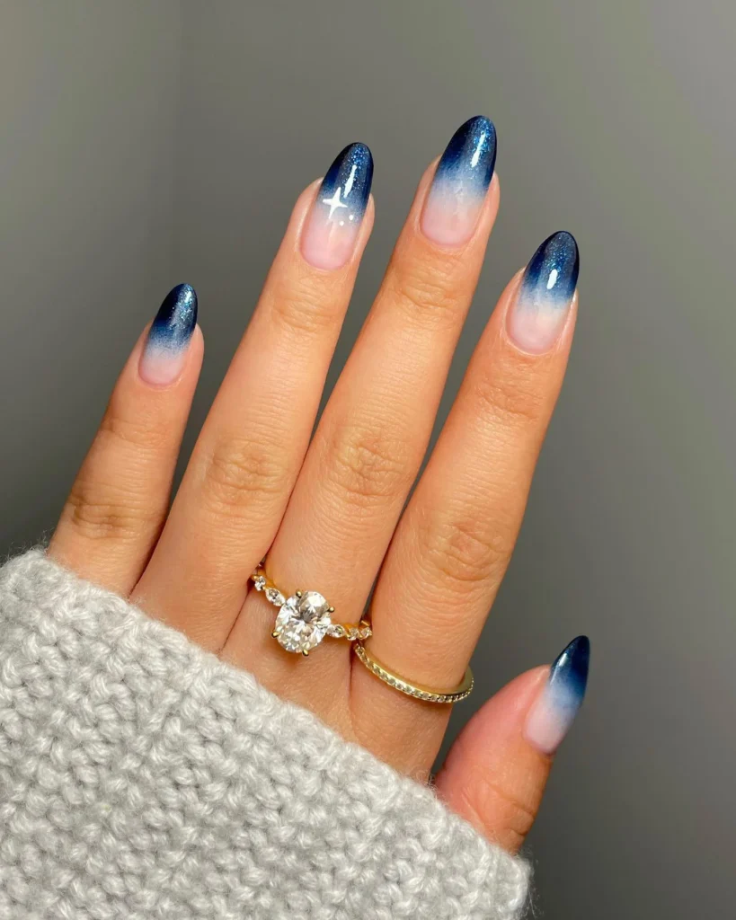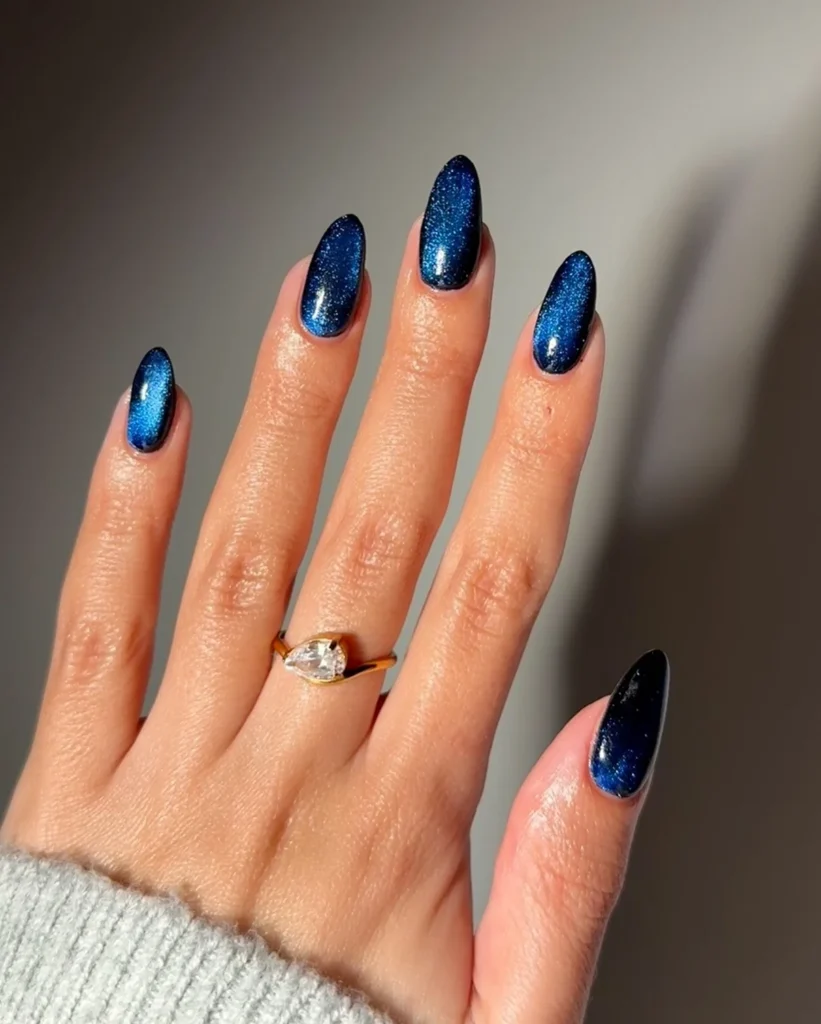 The shimmer catches sunlight like sugar dust on glass. These dark blue nails look like they’re dipped in midnight magic. Whether you’re typing, texting, or holding a latte, they just radiate quiet confidence.