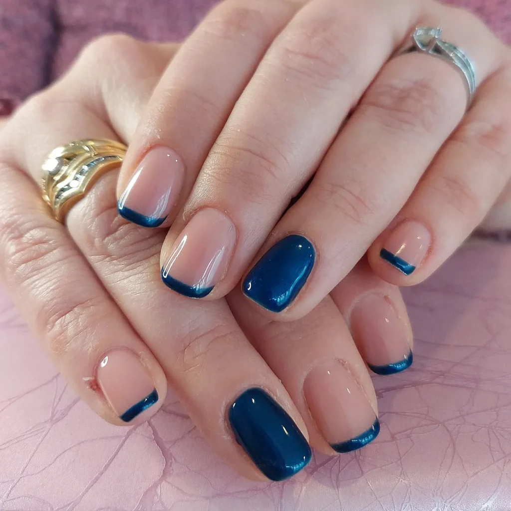 The clean nude base with bold dark blue French tips feels fresh and modern. It’s classic enough for work but stylish enough for a night out.