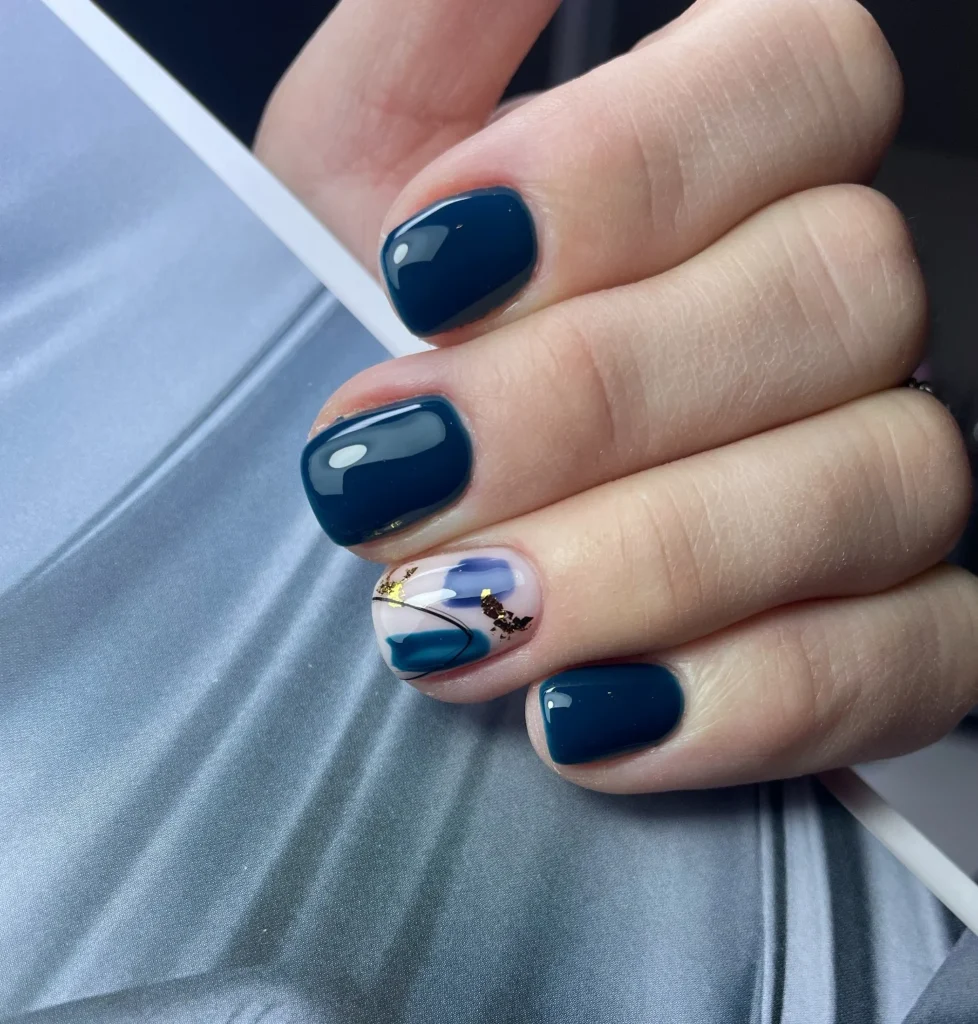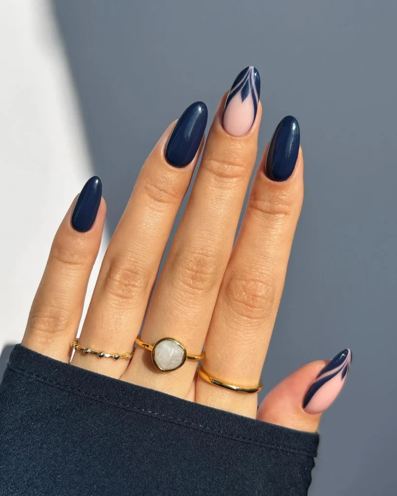 This one gives me modern-art-meets-minimalist energy. The soft nude base and deep blue abstract petal strokes look effortlessly cool. It’s trendy but still subtle enough for everyday wear.