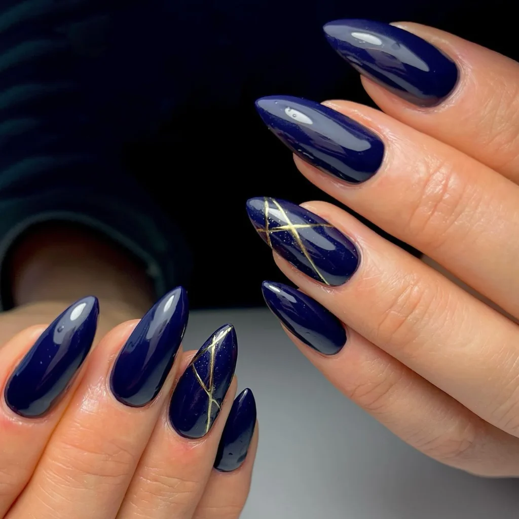 The navy base meets gold in this sleek and chic nail art. It’s giving luxury with a whisper, not a shout. Every line catches the light like jewelry in motion. The gold detailing instantly elevates even the simplest outfit.