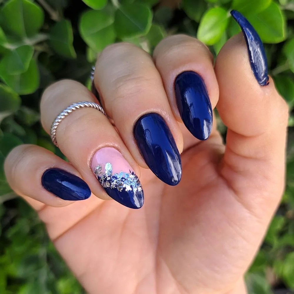 The moment I saw this nail design, I thought pure elegance. The dark blue polish paired with a silver glitter outline gives major red-carpet vibes. It’s sleek, minimal, and effortlessly luxurious. Perfect for anyone who loves a touch of sparkle without overdoing it.