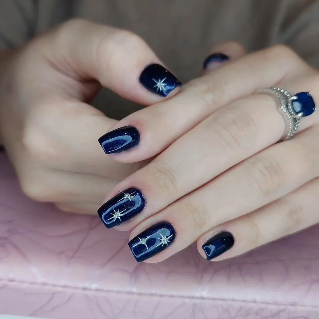 Friends keep asking where I got this nail art done, that’s how good it looks. The square shape with twinkling silver stars over a glossy navy base is everything celestial and classy. It’s the kind of look that never fades out of style.