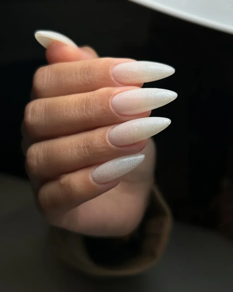 A soft snowfall vibe lands right on your fingertips. The milky-to-icy ombré catches the light with a whisper of shimmer, like fresh powder under a streetlamp.