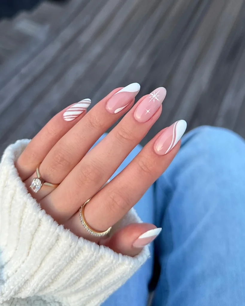 Clean white curves, a tiny star, and a single snowflake over a soft pink base—minimal winter poetry. The negative space keeps it airy, while the white pops against light skin for a fresh, polished look.