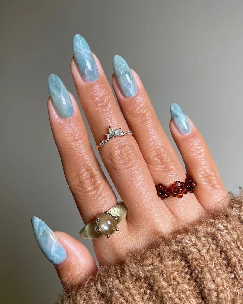 This icy blue marble design has a frosted, gemstone-like appearance—soft veins of white ripple through a pale aqua base, resembling frozen lakes. On light skin, the effect is crystal-clear and effortlessly chic.