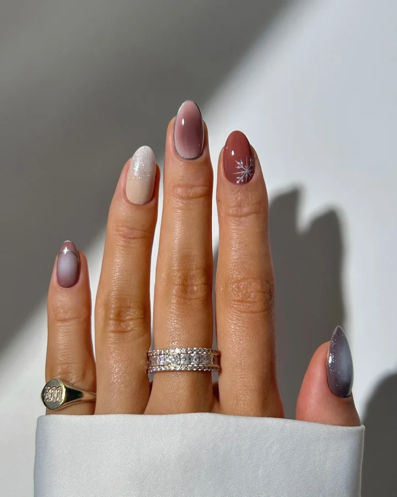 Think cozy latte meets winter stargaze. A rosy “aura” nail, a sugar-snow accent, and cat-eye shimmer sit beside a cocoa nail stamped with a delicate snowflake. The mix-and-match palette flatters light skin without washing it out—warm, dimensional, and very chic.