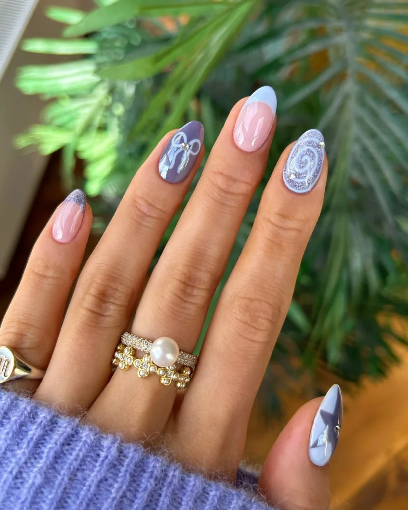 A hint of fairy-tale energy, icy lilac, baby blue, glitter edges, and a tiny chrome bow that looks like it was tied by a snow sprite. Pastel cool tones brighten light skin and deliver a playful, polished winter moment.