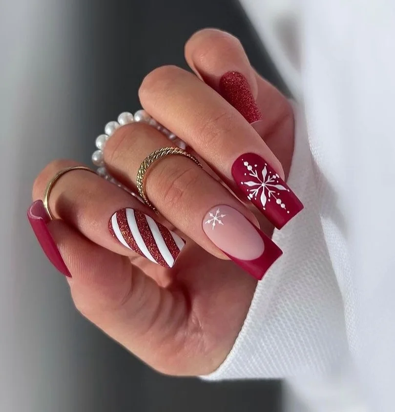 Nothing says festive like glittery red nails. A few white snowflakes and subtle dotted accents add a winter touch, while the shimmer ensures every move catches the light.