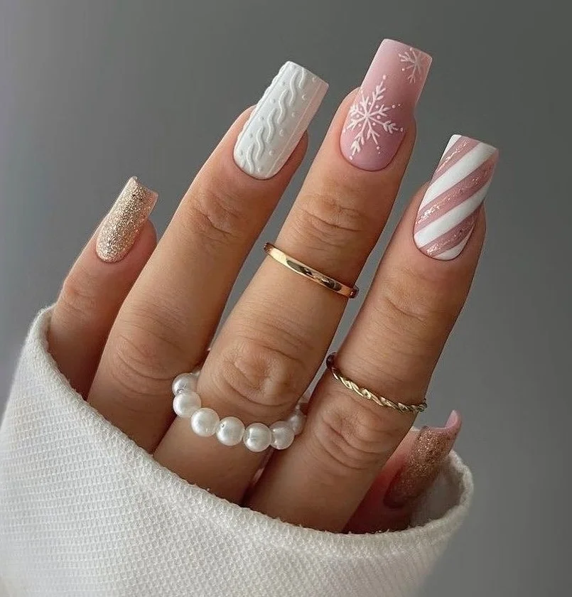 Soft pinks, cable-knit texture, sparkly stripes, and a gentle snowflake—like a cozy sweater and fresh snow in one look. The blush tones flatter fair complexions while the textures add interest without going loud.