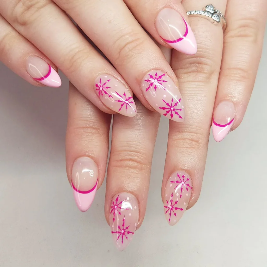Starting with a soft nude base, these almond-shaped nails show off a modern version of the French tip with sleek pink curves. The hot pink shade is both bold and playful, adding vibrancy without overpowering the look. Snowflake details on accent nails introduce a frosty winter vibe that feels perfect for the season.